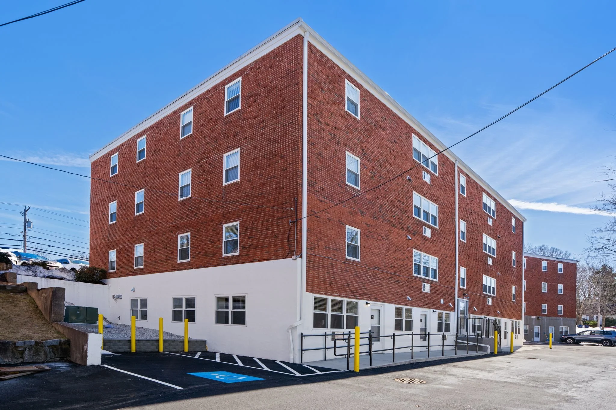 The rear elevation reflects the practical scope of the work, where targeted interventions addressed accessibility, envelope performance, and site infrastructure. Improvements were integrated into the existing building with minimal disruption, aligning new elements with the character of the original structure.